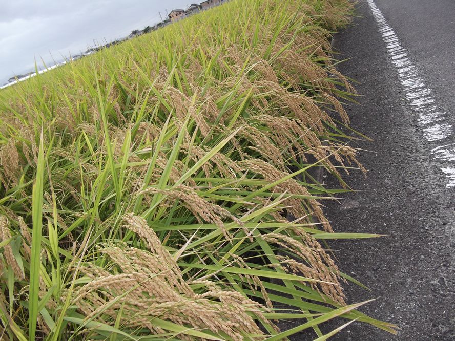 茎が固くしっかり作ったから・・。少々の雨風でも倒れない。今日カマをいれたら、本当に一本一本の強い茎に感動。おまけに農協指導課に聞いたら、1穂に夢しずくは平均84個、実をつけるそうだ。うちのは120個ついていた。それでも倒れない。