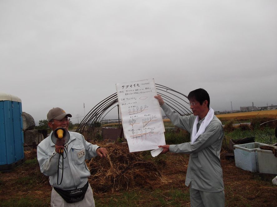 5/21朝7時より有機農業研修有機田と土作りは自然と環境によって行う自然田へのナス・ピーマン・きゅうりの植え付けにおくらの種まき。中央写真は自然田、人の手を極力いれず、耕さない。よって微生物の繁殖によって土を創る。微生物のすみかになった土は、ふわふわでどんどん下に根をのばす。先生いわく種まきや移植は天気予報で雨が降る前に行う。後は朝露にまかせる。種まき後の水やりなんてしたことがない。すわって植物や我々と同じ目線になって語られる。