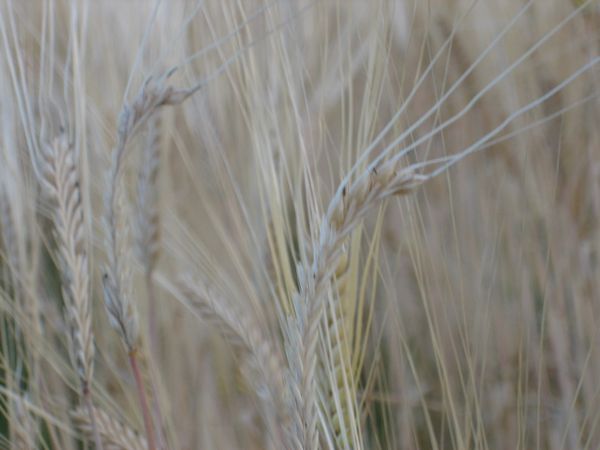 写真左:大麦サチホゴールデン、穂が45~90℃くらいになったら含有水分20%強にて刈り取り適期です。